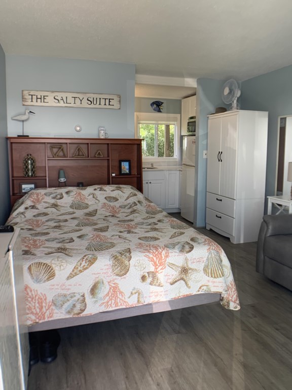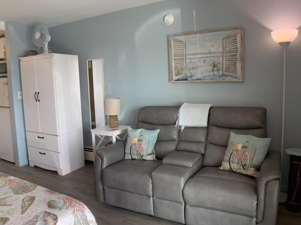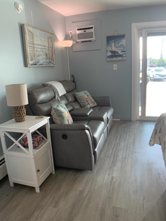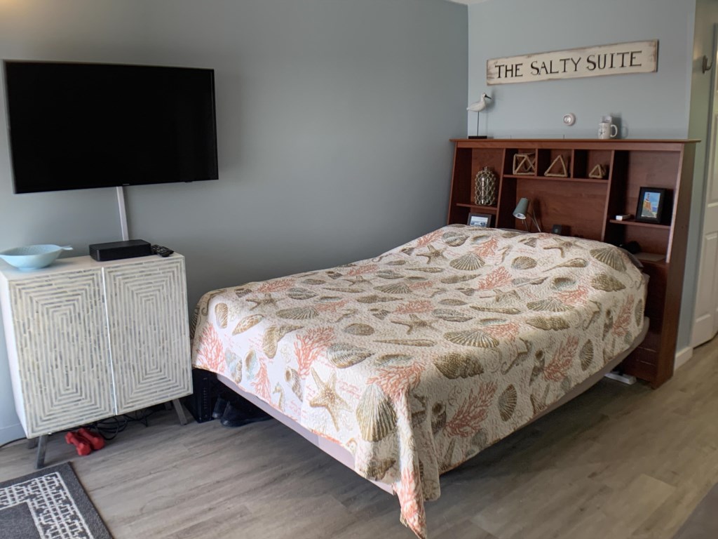 North beach area of Hampton Beach. Atlantic Ocean just across the street. Salty Suite I is a cozy ground floor Studio/Efficiency (1 room with a separate bath room) perfect for that stay where you're half way to everywhere, but at the beach. Summer walks along the sandy beach or playing in the surf, yet you're minutes to Portsmouth, or Boston. This unit is furnished with a Queen Size bed, wardrobe closet, reclining couch, flat screen tv and a small kitchenette with refrigerator, microwave, air fryer, coffee pot and utensils. a 3/4 bath just off the kitchen. The on-site coin-op laundry is just across the parking lot in building 1. Parking for 1 vehicle, no smoking, no pets. In-ground pool is the perfect compliment to the sandy beach. Easy access.